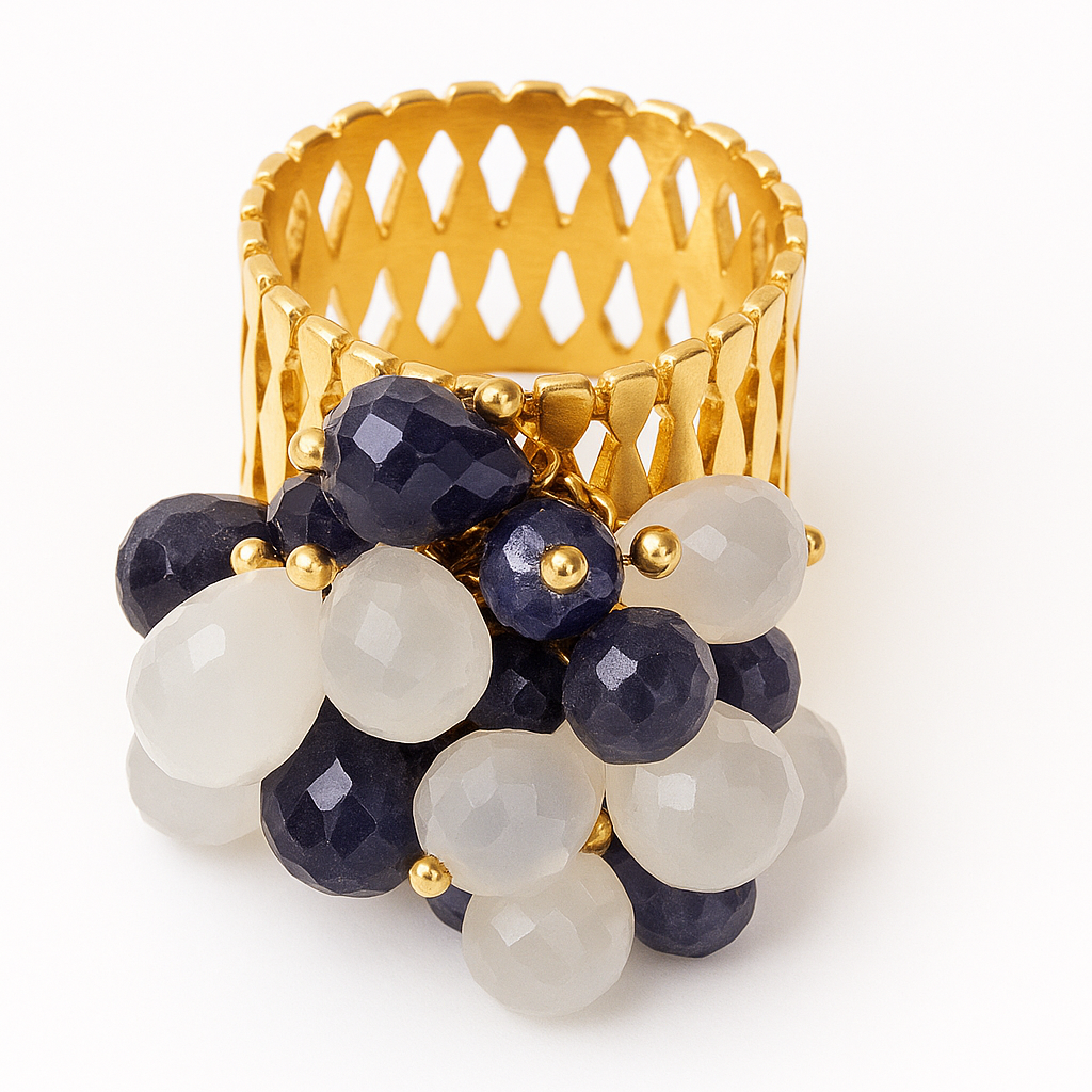 A thick gold band is adorned with 8 grey beads, making this ring Size 8.