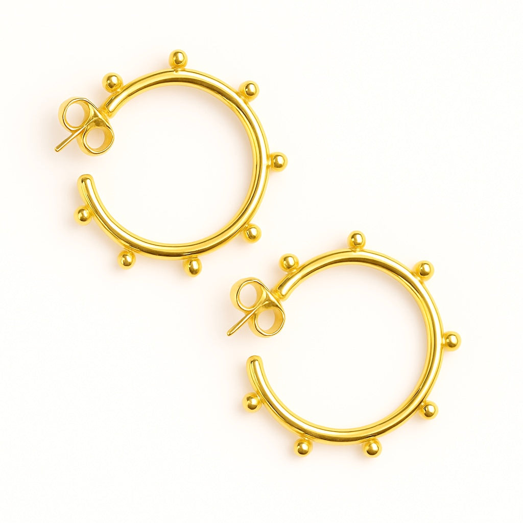 The Merry and Sweet Collection features our gold hoops in 2 thicknesses across a full range of sizes. Each piece has hand crafted gold balls soldered on which catch light and movement to maximize visual impact.