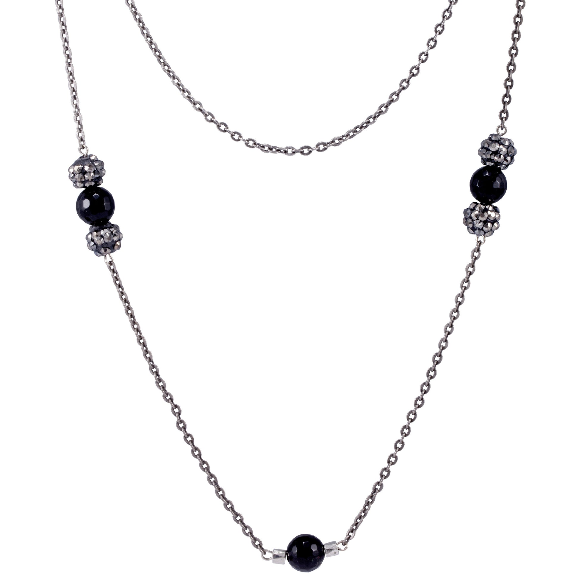 Agate and shambalas connected on this 48" long necklace. Chain is in old silver